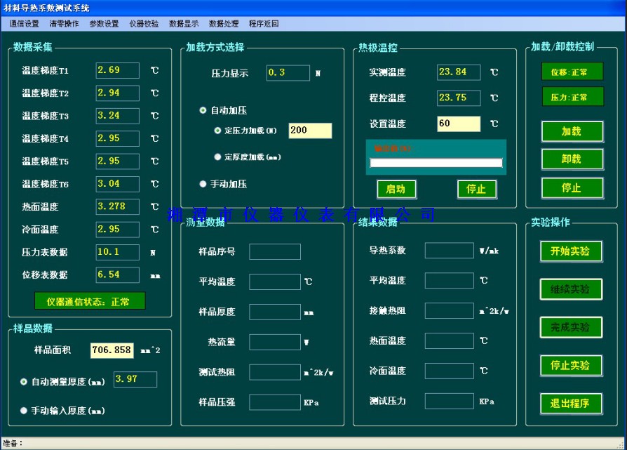 儀器特點(diǎn):帶自動(dòng)加壓(配用減速電機(jī)、高精度壓力傳感器、調(diào)速器),自動(dòng)測厚裝置(配用高精度位移傳感器測量),并連計(jì)算機(jī)實(shí)現(xiàn)全自動(dòng)控制。儀器采用6點(diǎn)溫度梯度檢測,提高了測試精度??蓹z測不同壓力下熱阻曲線,采用優(yōu)化的數(shù)學(xué)模型,可測量材料導(dǎo)熱系數(shù)和熱阻以及界面處接觸熱阻等多個(gè)參數(shù)。